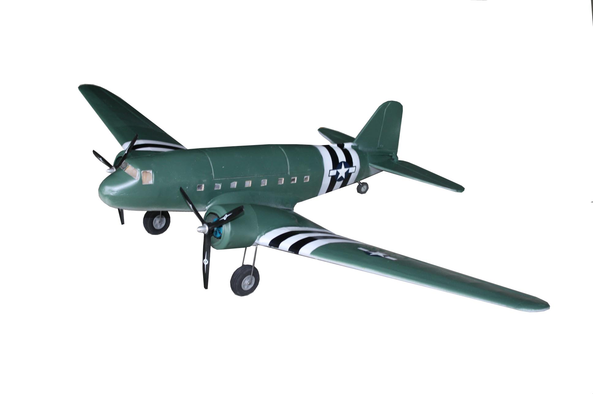 <sup> </sup>The C-47 had a 96’ wing span. Scaling to .44″ = 1 ft. (same scale as our WACO CG-4 glider) gave us a span of 42″. Unfortunately to accommodate the 7″ props, we had to add 1 1/2″ to the wing on both sides between the engine nacelle and fuselage. Giving the BMJR C-47 a span of 45″. This is the only deviation from the scale 3 view.