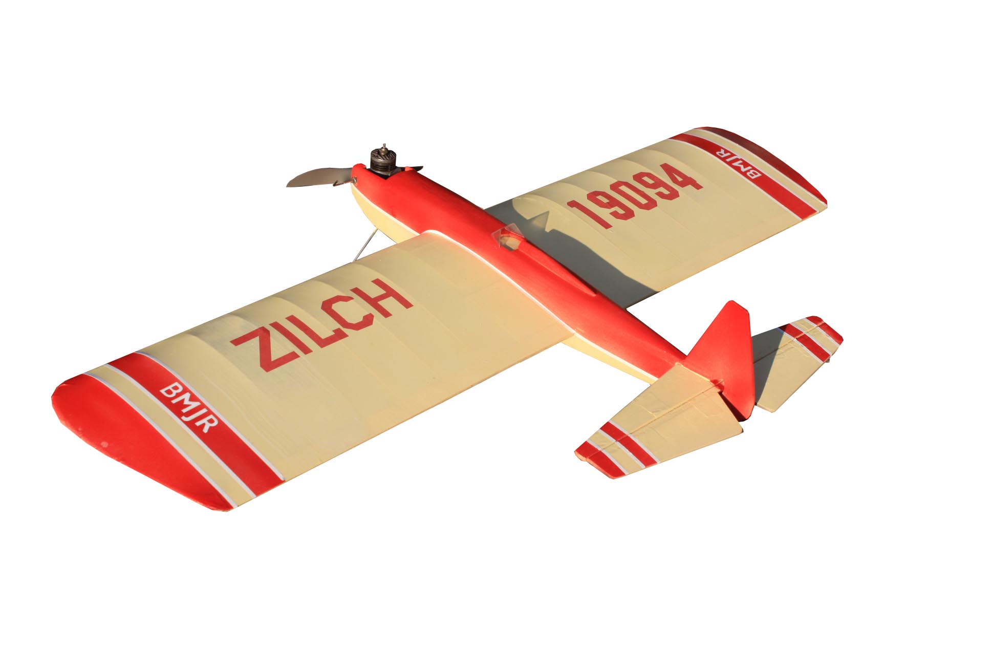 The Zilch was designed by Jim Saftig and 1st published in the April 1951 Model Airplane News, and later in the Feb 1979 Model Aviation. Most popular version was that kitted by Berklley (originally the super Zilch was in 1947). Today SIG still offers a Berkley mini-Zilch. The BMJR Zilch W-D is based on an old Wee-Duper Zilch plan provided by a friend which had little identification as to its origin. We scaled it to the approximate size of a Ringmaster Jr. for .09 or .15 power. Model has a 34″ span and 255 sq. in. area.